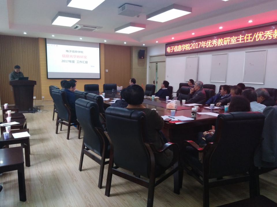 的七位教研室主任代表各自教研室就政治素养、教育教学、教研活动、公共事务等方面做了精彩答辩。最后,通过评审委员会对答辩进行综合评审,授予何培宇教授、张启灿教授为“优秀教研室主任”称号,授予电子一教研室、信息光学教研室为“优秀教研室”称号,授予余艳梅副教授、陈雨副教授、高勇教授、刘长军教授、周昕教授为“优胜教研室主任”称号,授予电子二教研室、电子三教研室、通信教研室、无线电物理教研室、激光教研室为“优胜教研室”称号。