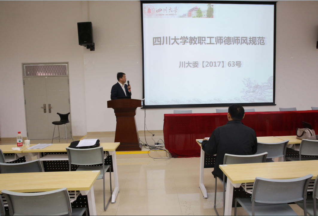 党委邰明松书记就“四川大学教职工师德师风规范”展开了介绍。其中,他主要强调了意识形态工作的重要性,并就如何提高做好意识形态工作的能力提出了建议。他还强调了如何正确处理师生关系来更好地进行培养工作。