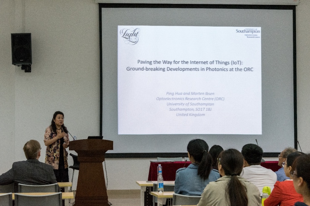 英国南安普顿大学光电子研究中心在光纤、光纤光放大器、光纤陀螺仪、光纤传感技术、光纤激光器等方面的研究处于世界领先水平。Morten Ibsen 教授和华萍高级研究员首先介绍了英国南安普顿大学优秀的教学条件及科研环境,然后以 “Paving the Way for the Internet of Things: Ground-breaking Developments in Photonics at the ORC” 为主题,详细介绍了南安普顿大学光电子研究中心在单频光纤激光器、光纤光栅制备及传感等领域的突破性成就及进展。讲座后,专家与师生进行了学术交流和探讨,就诸多热点难点学术问题展开了激烈的讨论。