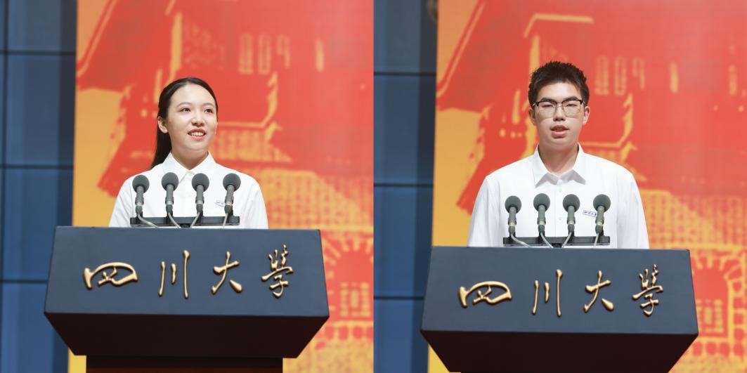 2021级本科生黄睿和新生代表、古典学系2025级本科生黄世豪同学在发言中向学校、师长和父母的培养表示衷心感谢。他们说,作为新时代的川大人,我们将不悔所选、不负所学,以赤子之心,求学业精进,在传承中创新突破,在奋斗中勇毅前行,书写属于新一代川大人的青春篇章。