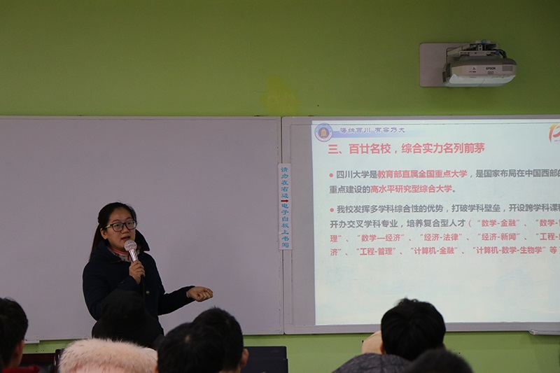 的联系老师,并留下团队队长的联系方式。”本次社会实践活动内容为四川大学在校学生回到母校,让学弟学妹了解川大,并帮助他们提前了解大学,做好报考准备。为此,吴秀玲老师向在座学生简要介绍了四川大学的悠久历史、文化氛围和知名校友,还向同学们说明了川大在2017年的招生情况,这对同学们回母校宣讲有很大的帮助。之后,陈笃海副书记进行了简要补充,提醒回校宣讲的同学们注意对川大最低录取分数线的介绍。最后,陈书记以“海纳百川,有容乃大”校训为结束语,鼓励回校宣讲的同学们充分利用实践机会,锻炼自己,向母校学子宣传川大,为川大美好未来献出自己的力量。