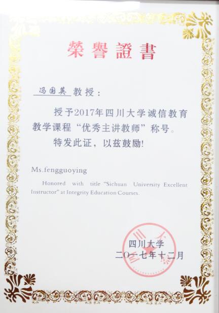 院长冯国英教授获得了四川大学2017年诚信教育教学课程“优秀主讲教师”