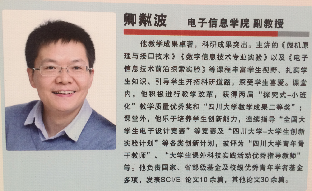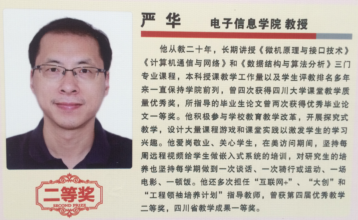刘长军老师获得 “卓越教学奖”, 严华老师获得“星火校友奖教金”, 卿粼波老师获得“五粮春青年教师优秀教学奖”。本科教学先进个人中,8bo即时比分