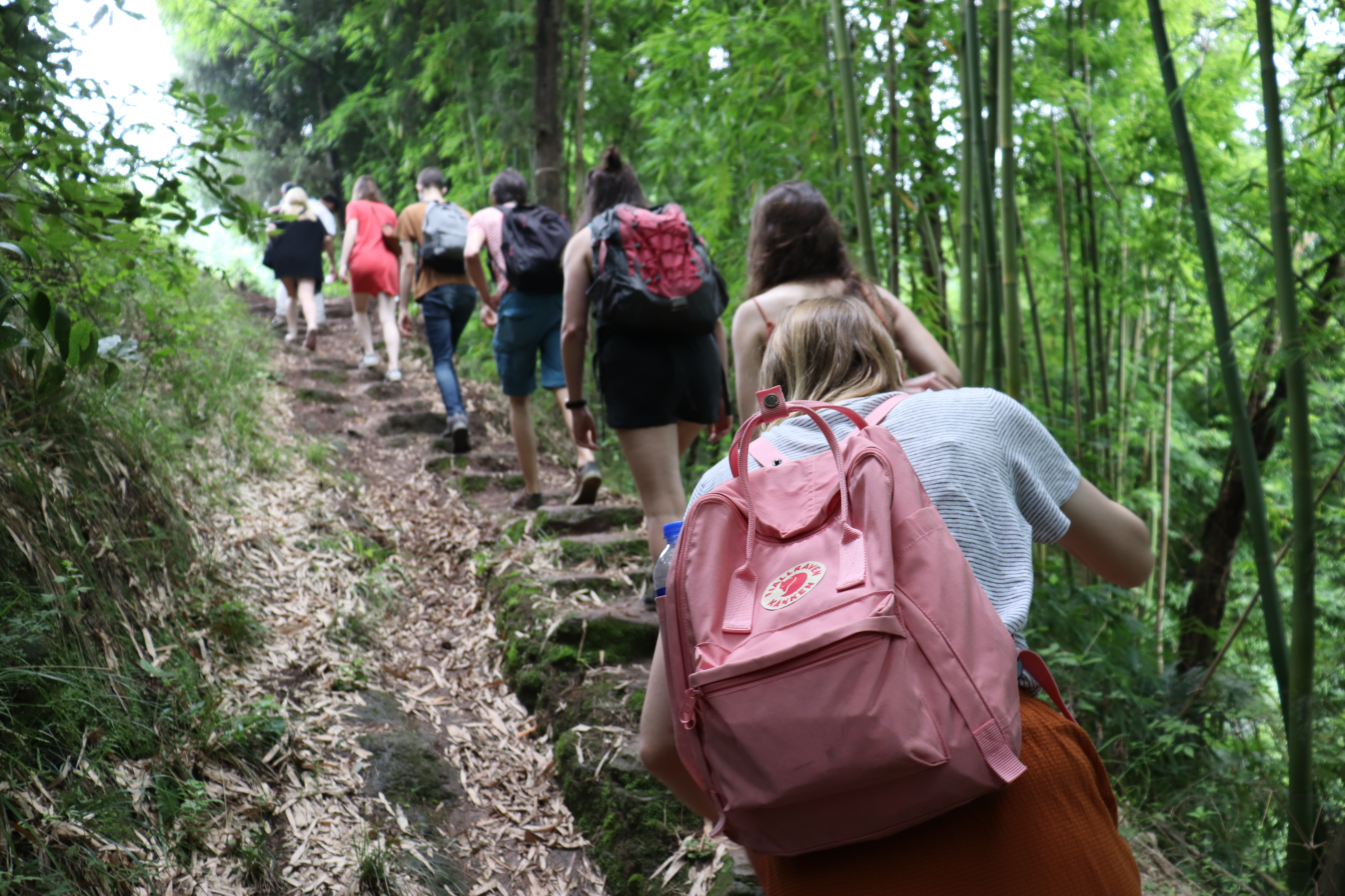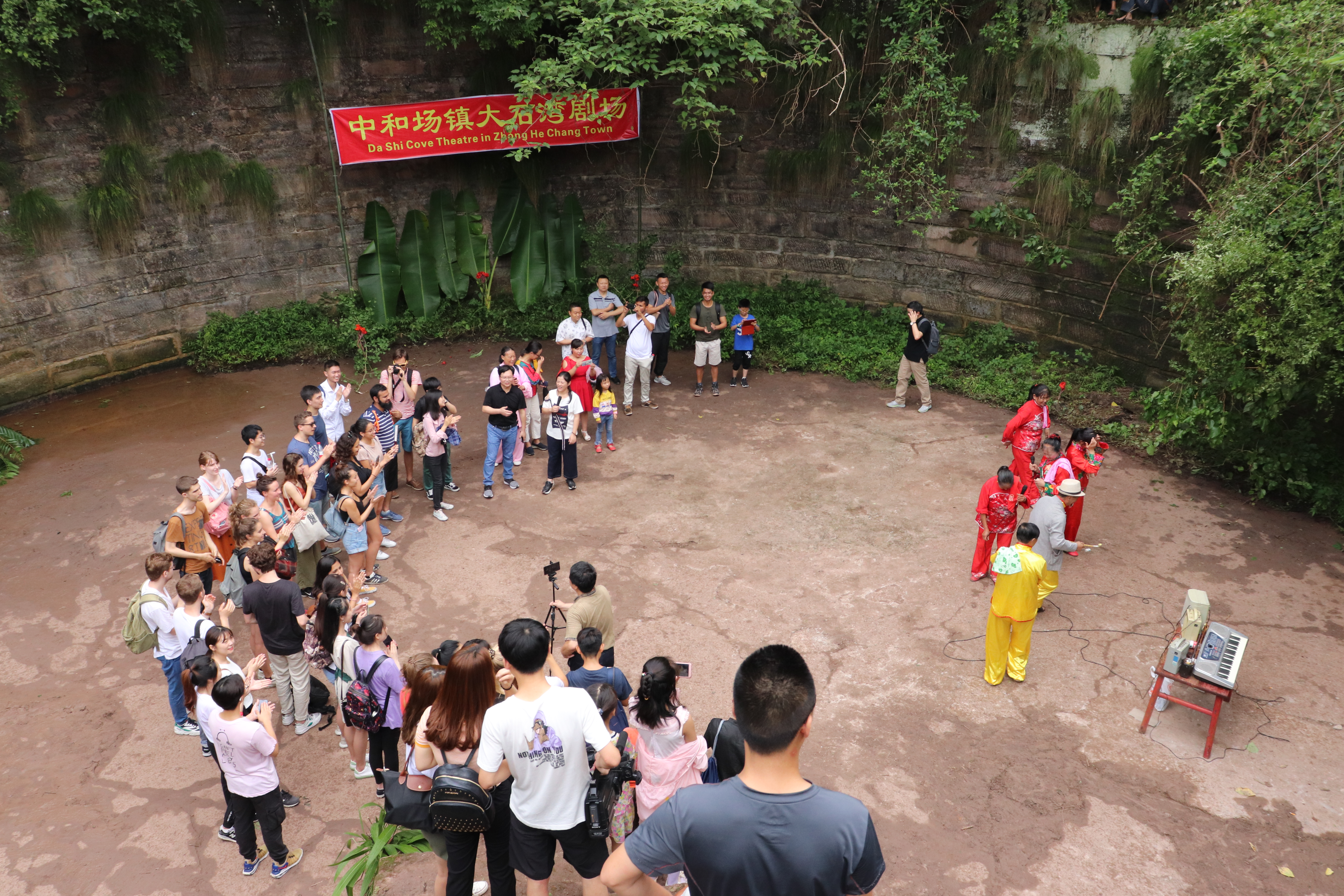 上午十一点,国际交流营同学及志愿者、媒体同仁、太极老师们到达山脚,经过一段山路的攀爬大家都顺利抵达中和场镇白鹤村大石湾(大石湾蓄水池建于上世纪七八十年代,当时百姓战天斗地,全凭人力在半山上修建出来,地震后不能蓄水,现进行资源盘活再利用,中和场镇这类的蓄水池还有很多。