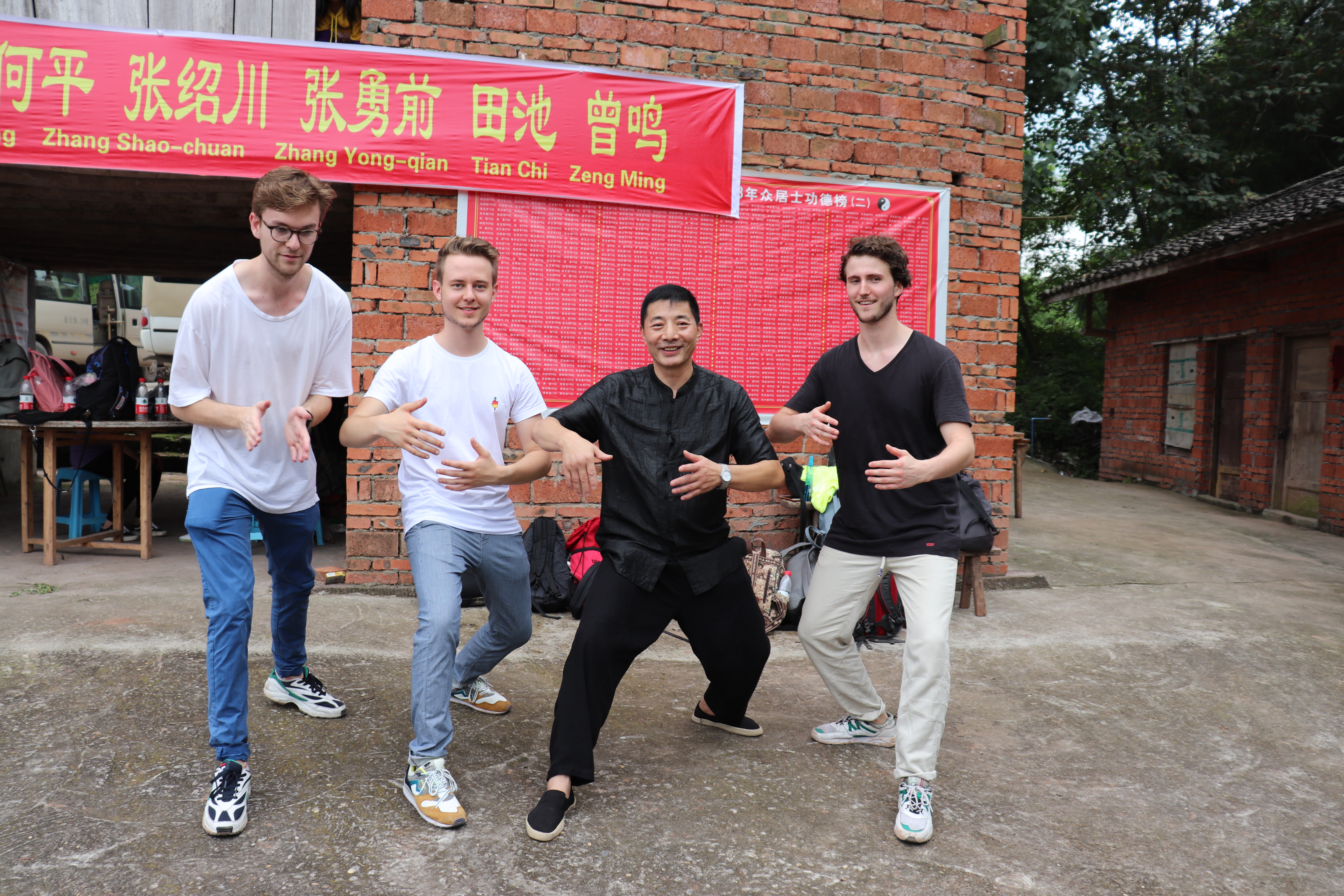 随后,老师及同学一行来到中和场镇的老君观,由环禅道功夫团何平、张绍川、张勇前、田池、曾鸣等五位老师教授交流营学生太极功夫。中国功夫风靡全球,留学生对于太极也早闻大名,这次能够零距离的体验到太极,早就跃跃欲试了。在几位老师的演示下,大家纷纷摆好姿势,练得也是有模有样。