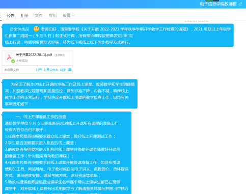 从检查和学生反馈情况看,上课老师都提前建立线上课堂做好线上开课测试工作,上课提前到岗,老师们备课内容充实,在直播系统里讲课声音清楚,课程内容展示清晰、顺畅,并能利用系统提供的各种功能和QQ群与学生互动,明确告知学生课程学习目标、要求及考核方式。学生到课率高、课堂气氛良好。