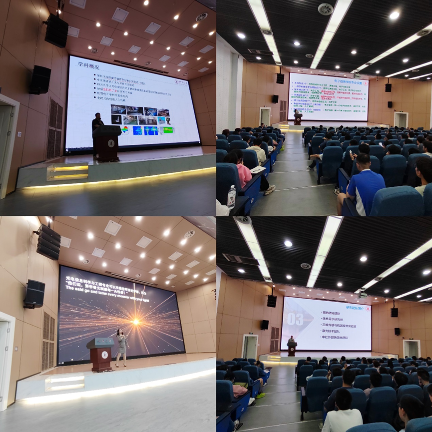 然后,由梁厚昆老师、张蓉竹老师介绍光电信息科学与工程专业。首先是张蓉竹老师向同学详细介绍了本专业要学什么、学完之后能在哪些领域干什么等几个学生重点关注的问题,接着由梁厚昆老师以实验室的研究方向及相关实验进展做了有趣的讲解,为同学们了解本专业奠定了更好的基础。