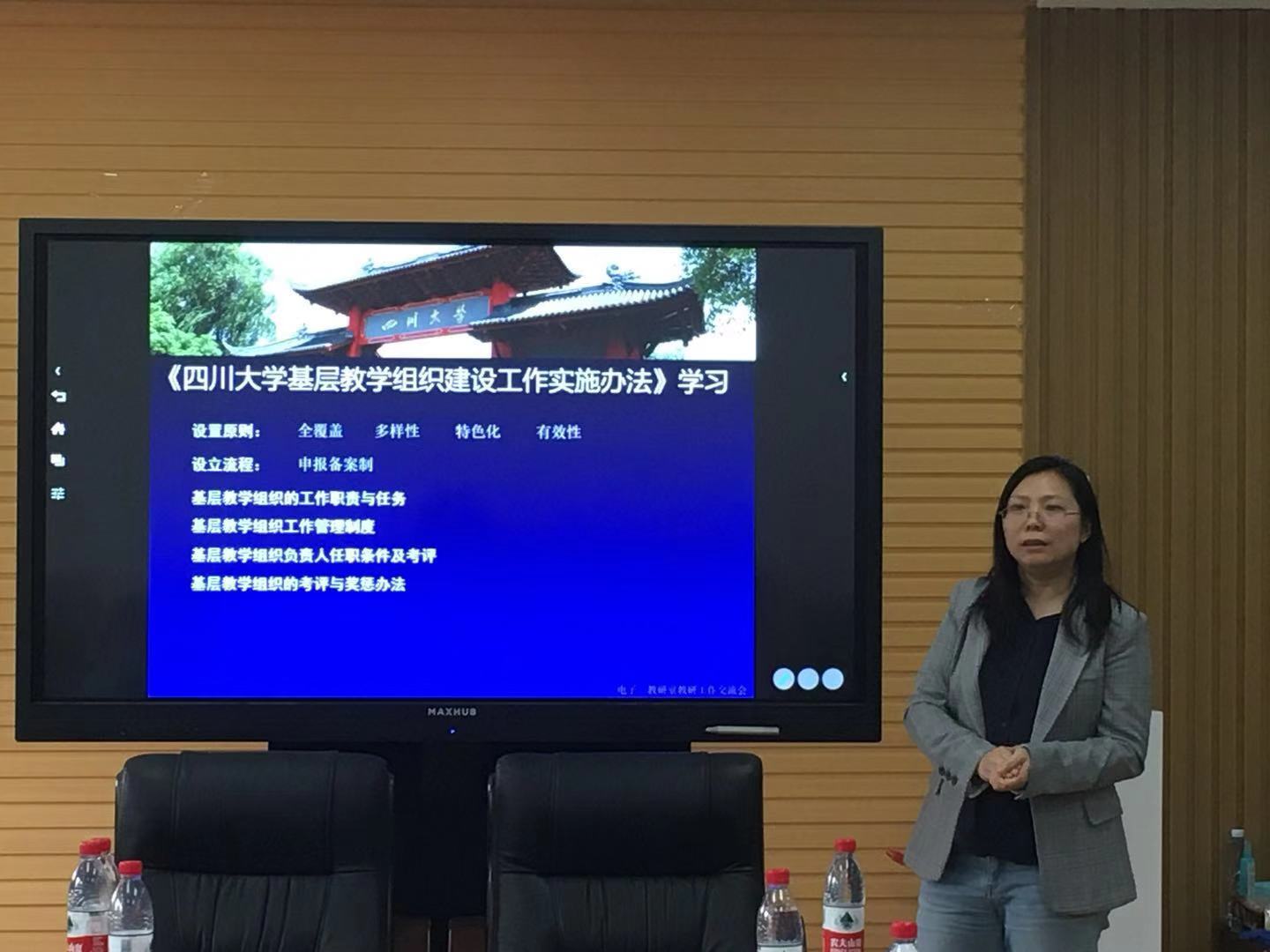 会上,电子二教研室主任余艳梅副教授分享了学习《四川大学基层教学组织建设工作实施办法》的体会。