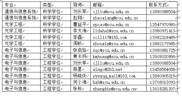 通信与信息系统专业(科学学位博士)、光学工程(科学学位博士)专业、电子与信息(工程学位博士)接收博士调剂申请,有调剂意愿的考生若满足以下条件,欢迎提交调剂申请:报考学校为四川大学,报考专业为物理学、化学、化工、制造学、计算机、电气、高分子、空天及相近专业,单科分及总分均达到所报考专业的分数线,且英语40分以上,专业课50分以上(拟调剂专业为通信与信息系统)或专业课48分及以上(拟调剂专业为光学工程)或专业课45分以上(拟调剂专业为电子与信息)。