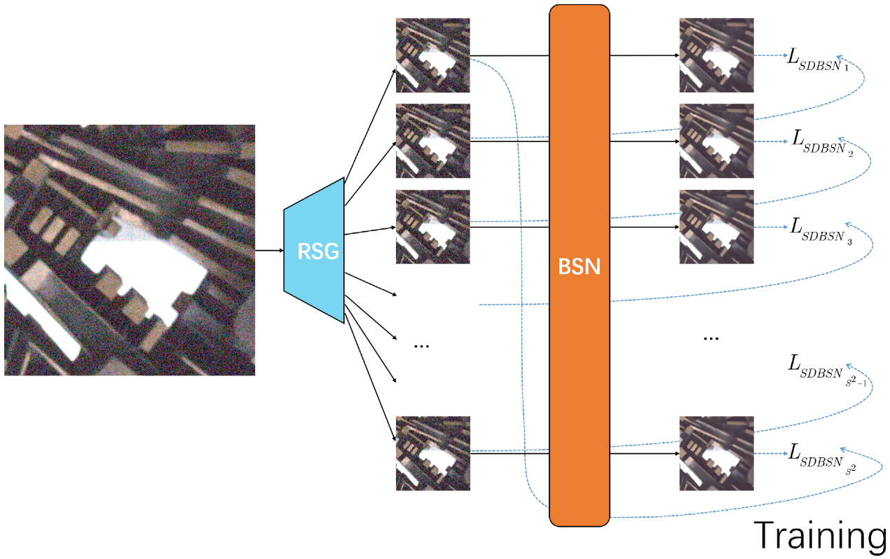 2. 采用循环策略的训练框架:如图2所示,论文通过RSG策略用一张带噪图像获得了s^2个可供训练的子样本。在训练中,论文将RSG_i(y)和RSG_(i+1)(y)之间的差异视为扰动,并将它们分别视为BSN的输入和目标,构建了一种新的采样差异损失函数。不同于常规训练BSN的方法对每张图的每次训练只需要两个子样本,论文通过循环策略将使用生成的全部s^2个子样本。由于RSG策略得到的子样本是随机生成的,因此训练数据也是随机的。损失函数中每个输入对应的目标都不同,因此避免了两个子样本在循环期间形成固定的映射。这种循环损失具有以下优点:a.对原始噪声图像的全部像素施加了约束;b.确保RSG生成的所有子样本都能达到充分利用;c.使得BSN的训练更加具有鲁棒性。