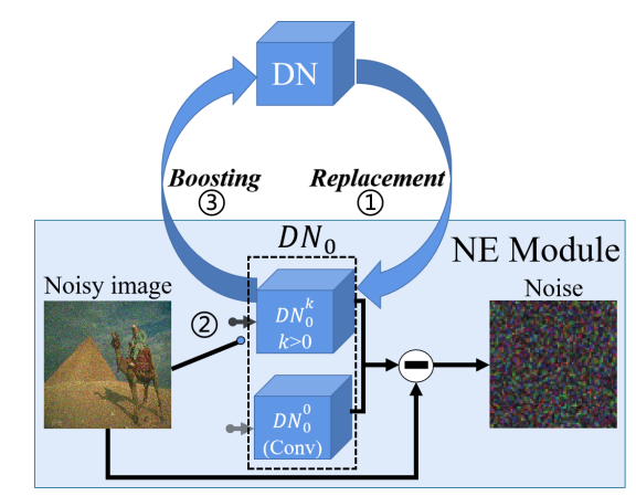 3. SC策略:图3所示为SC策略。该结构由噪声提取模块(NE)和去噪器(DN)组成。如前几小节所述,NE模块从噪声图像中提取噪声,并引导生成器生成高质量的合成噪声图像。为了训练PGabNet,首先在NE模块中使用一个简单且可学习的线性卷积层作为DN0。然后,对去噪器进行迭代替换和增强,k表示迭代次数。在每次迭代过程中,当前更强的去噪器DN替换NE模块中先前较弱的去噪器DN0,从而显著提高更新后去噪器的性能。通过对NE模块内外的去噪器采用SC策略,可以得到更好的DN0,从而可以提取更准确的噪声。这将产生更真实的合成噪声对,并通过更高质量的合成样本迭代提高更新DN的性能。令人兴奋的是,本文观察到使用SC策略的DN性能比不使用SC策略的原始DN性能有了显著提高。