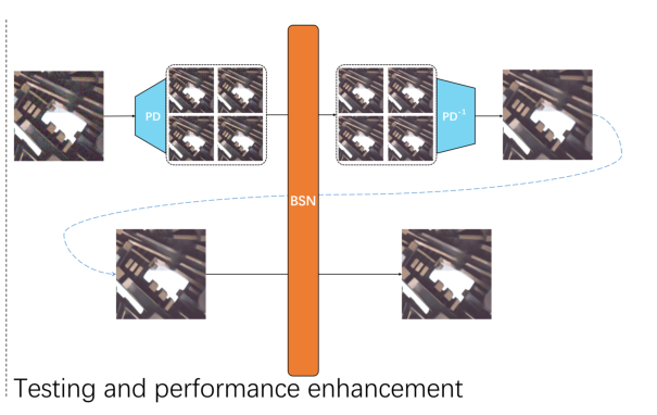 3.测试以及效果增强:如图3所示,论文使用RSG策略生成的随机子样本避免了去噪网络形成固定映射,但是其随机性也不可避免地导致去噪网络在测试阶段性能的下降。由于像素重组下采样(PD)子样本的每个点在原始图像中具有固定的位置,因此它具有固定的偏移方向,其随机性相比本论文提出的RSG策略较小,因此在测试阶段使用PD采样模式来稳定测试结果。最后,本论文通过BSN对去噪后的图像进行二次去噪,以去除不平滑的伪影使得图像更加自然。