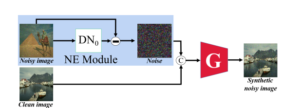 方法:1. 基于滤波引导的噪声生成器:如图1所示,由于不同图像内容的影响,合成高质量的真实噪声图像具有很强的挑战性。为了缓解这一困难,本文为GAN模型提出了一种新颖的滤波引导合成噪声图像生成器G,它能更好地捕捉噪声信息。由于直接学习噪声分布比较困难,本文并不直接向G输入噪声图像和干净图像,而是使用NE模块来获取噪声。具体来说,使用一个名为DN0的可学习卷积块进行去噪,然后通过从原始噪声图像中减去去噪图像来获得噪声。这种方法降低了生成器的学习难度,促使其更加专注于合成高质量的噪声图像,从而提高整体去噪性能。