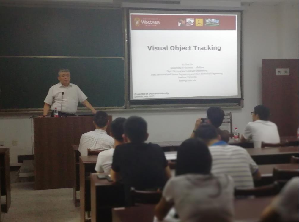 胡教授详细地介绍了视觉对象跟踪的背景、原理、研究进展以及其工业应用,特别讲解了视觉对象跟踪研究中的难点,阐述了这方面研究的前景,并表达了对同学们的殷切期盼。报告后,胡教授主动与现场师生互动交流,对大家提出的问题进行了细心的解答,也表达了今后能与四川大学进行更多、更深层次的合作与交流的愿望。