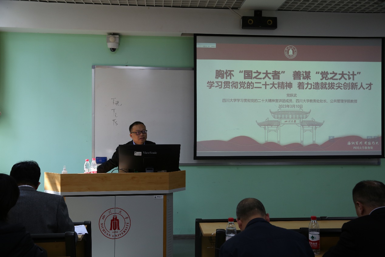 人才培养工作,从学校的历史、教育发展的主要特点、基本经验、建设成果、人才培养成就、六大亮点、一大经验、构建“中国范式”等方面重点阐述了如何坚定推动党的二十大决策部署在四川大学落地生根,着力造就拔尖创新人才,为党育人,为国育才。党跃武教授生动详实的讲解获得了与会师生的热烈掌声。