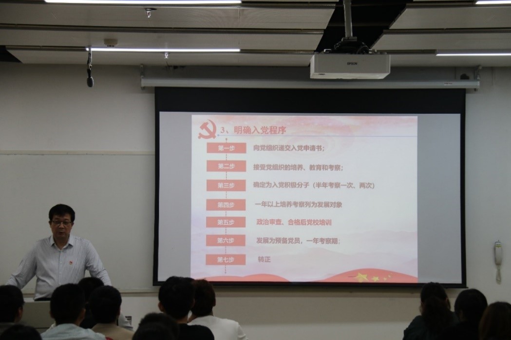 随后,邰明松详细介绍了成为一名共产党员的基本条件,强调申请入党要从思想和行动上承认中国共产党的纲领和章程,执行党的决议,并明确了入党的程序,指出端正入党动机是争取加入党组织的前提。邰明松书记从思想政治、道德品质、学习态度、工作能力、心理素质等方面论述了成为一名大学生党员的标准,鼓励同学们要以自己的实际行动,积极向党组织靠拢。