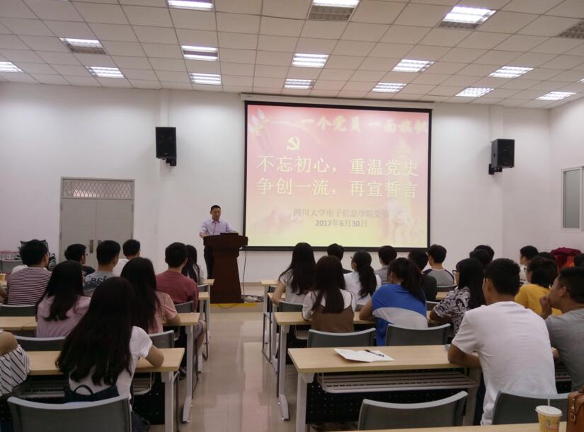 活动由李运国老师主持,院党委副书记陈笃海教授做了主题讲话。陈书记回顾党史,介绍了党在新形势下的取得的当代可喜成绩,并结合四川大学近期召开的第八次党代会,向全体与会党员提出殷切期望,希望学生党员同志牢记使命,不忘初心,坚持共产党领导,全心全意为人民服务!为全面推进学校党的建设新的伟大工程和建设世界一流大学新的伟大事业贡献力量,以优异的成绩迎接党的十九大顺利召开!接着,陈书记带领全体党员面向党旗,庄严宣誓,不忘初心,牢记使命!
