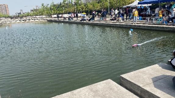 3月28日8:15,120个参赛队伍将自己精心设计的船模放在青春广场进行展示。多数船模以红色元素为主,深刻体现了本次船模大赛的主题,同时吸引了广场上同学的注意,大家纷纷为自己心仪的船模投票,现场气氛十分热闹。11:30,外观评分结束,选手们带走自己的船,为下午的水上竞速做准备。13:00,竞速正式开始,参赛队伍表现不凡。赛道上,船只不惧险阻,或稳健前行,或急速航行,船只上的五星红旗高高飘扬,正如党的理想信念指引着我们胜利的方向。伴随着观众们的助威声,18:00,所有参赛队伍完成比赛,本次船模大赛初赛圆满结束。