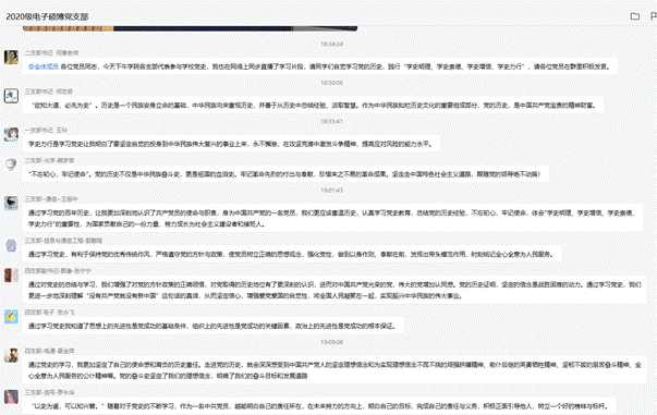 会后党员同志们积极交流学习心得。党的100年以来,历经风雨,是一段段充满艰辛困苦的奋斗历程、是一个个感人至深的感人故事,是共产党人践行初心使命的一百年。历史是最好的教科书,也是最好的清醒剂。学习四史,时时刻刻提醒着我,国家的今天,人民的今天,来之不易。作为一名中共党员,要坚决保持时刻的理论上清醒和政治上坚定,要把学习四史作为提升自身党性修养的养料,从而不断提升个人的思想境界,做一名积极纯粹的人,不忘初心,继续更好的为人民服务。
