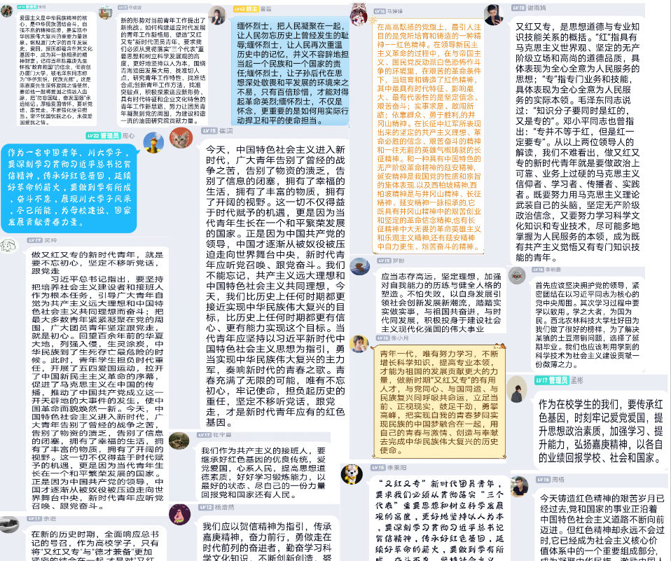 随后,通过线上学习观看贺信相关视频及宋甜同学朗读贺信精神,班级同学线上分享了活动心得。深入学习习近平总书记厦大建校100周年贺信精神,引导同学们准确把握贺信精神的核心要义,充分认识到总书记贺信精神的深刻内涵和重要意义。贺信精神,意蕴深远、内涵丰富,既是激励鞭策、也是目标导向,既是理论指导、也是实践要求。我们要将学习贯彻习近平总书记的贺信精神与党史学习教育紧密结合,认真学习领会和全方位贯彻落实习近平总书记致厦门大学贺信精神,坚持学做结合务求工作实效。