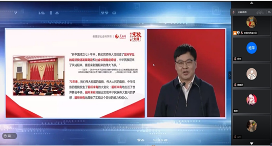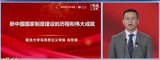 副教授、中国近现代史纲要研究室主任肖存良老师为我们授课。王雪超老师从民族独立新形象——由丧权辱国到屹立东方、国家统一新局面——由四分五裂到团结统一、人民解放新面貌——由受人压迫到成为主人三个方面为我们进行讲解,最后以没有共产党,就没有新中国作为结语,王雪超老师表示,希望同学们不负青春,不负韶华,不负时代,铭记新中国历史,走好人生道路,为实现中华民族伟大复兴贡献聪明才智。张志丹老师给我们讲的主题是新中国经济发展的奇迹,主要从新中国经济发展的奇迹“奇”在何处及新中国经济发展“密码”为何进行讲解,张志丹老师最后表示,在两个大局交叠互动的背景下,我们面临着各种机遇和挑战,但是我们有理由相信,只要始终坚持党的领导,牢牢把握中国经济奇迹发展的密码,继续发挥我们的制度优势,改革不停顿,开放不止步,发展不休止,方向不偏离,就一定能实现社会主义现代化和中华民族伟大复兴。肖存良老师讲的主题是新中国国家制度建设的历程和伟大成就,主要从社会主义革命和建设时期国家制度建设的历程与成就、改革开放新时期国家制度建设的历程与成就、中国特色社会主义新时代国家制度建设的历程与成就三方面进行讲解,最后肖存良老师表示,历史给我们的启示是国家制度建设始终要坚持党的领导,国家制度建设要始终坚持马克思主义基本原理与中国实际相结合,制度优势需要转化为治理效果。