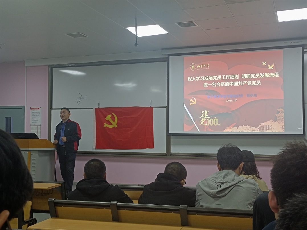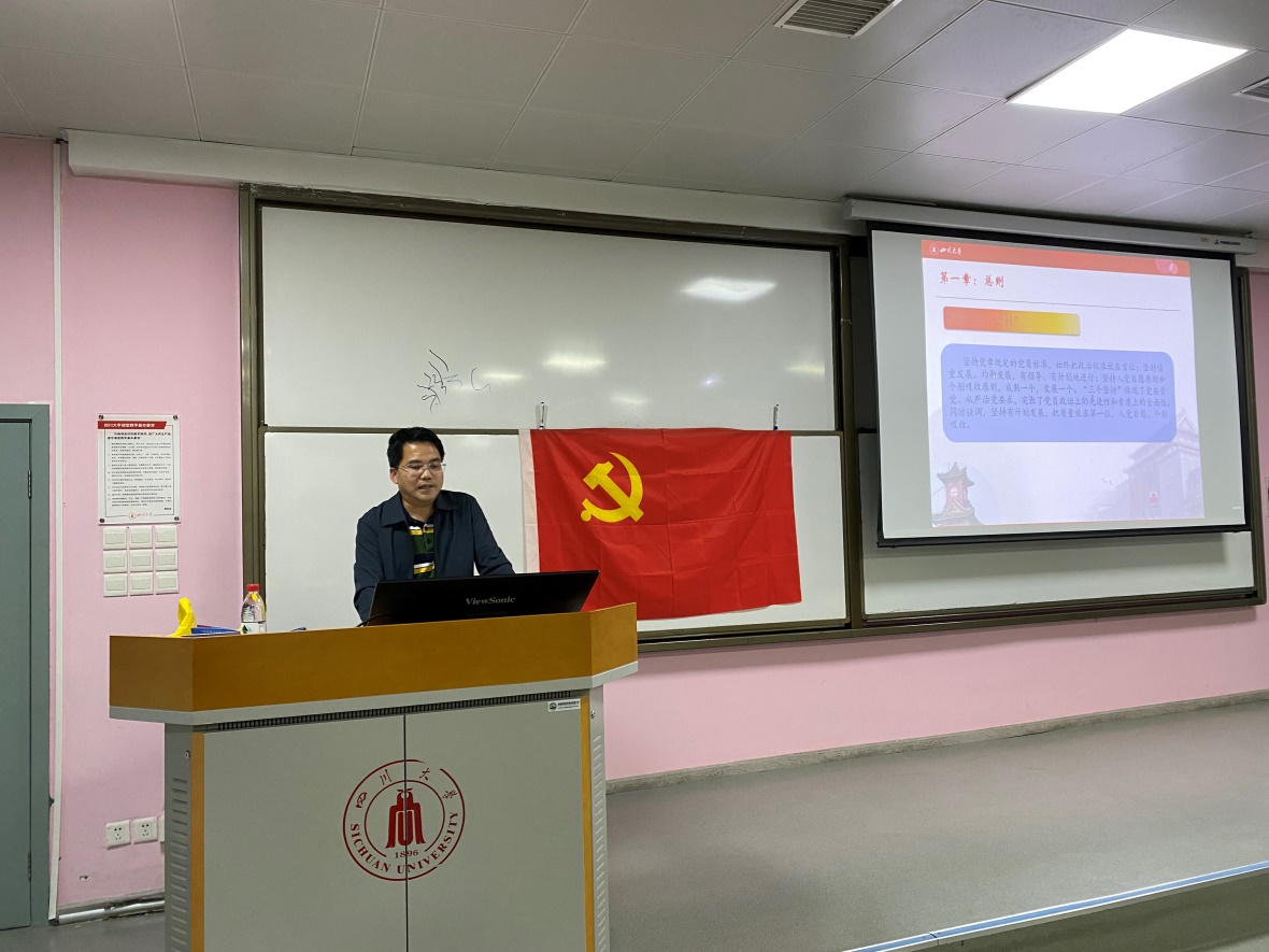 陈笃海重点从党要管党、从严治党和入党积极分子培养、入党介绍人的角度强调了本次培训的重要意义和目的。陈炳周从为什么要深入学习《中国共产党发展党员工作细则》、《中国共产党发展党员工作细则》出台的背景意义和主要内容以及四川大学就党员发展材料要注意的问题等几个方面进行了详细的剖析讲解。