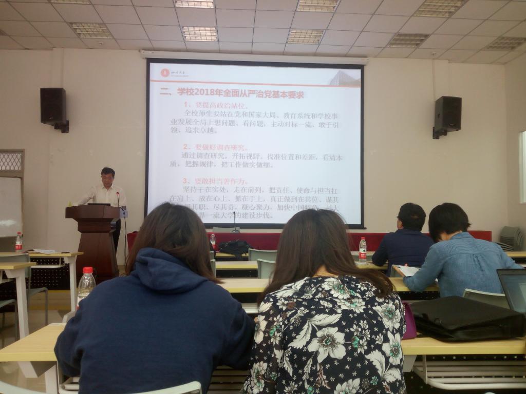 ‘双一流建设’事业不断前进”。会上,邰书记主要从学习贯彻习近平总书记在十九届中央纪委二次会议上的重要讲话、学习贯彻十九届中央纪委二次全会精神、认真落实教育系统全面从严治党工作视频会建设和认真落实四川大学2018年从严治党工作会议精神四个方面为具体内容向在场教师作报告。邰书记强调了学校2018年全面从严治党的三个要求:第一,要提高政治站位;第二,要做好调查研究;第三,要敢担当善作为。向全院教职工全面阐述了学校全面从严治党的六大主要任务和四大措施,最后,邰书记强调全院教职工严于律己,廉洁自律,党员干部要在科研、教学上发挥模范带头作用,努力推动8bo即时比分