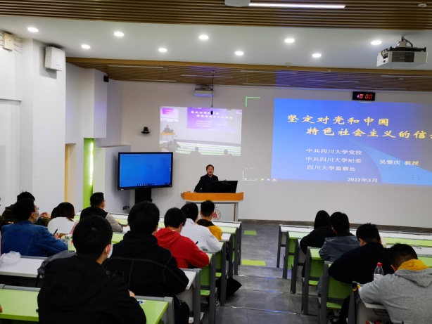第152期党校第二次行课在望江校区、江安校区通过线上线下方式结合召开。主讲会场设置在望江校区基础教学楼C201教室。为落实国家疫情防控措施,学员在教室佩戴口罩间隔落座。望江校区部分学员、江安校区全体学员通过网络会议的形式在各校区直播学习教室参与本次学习。