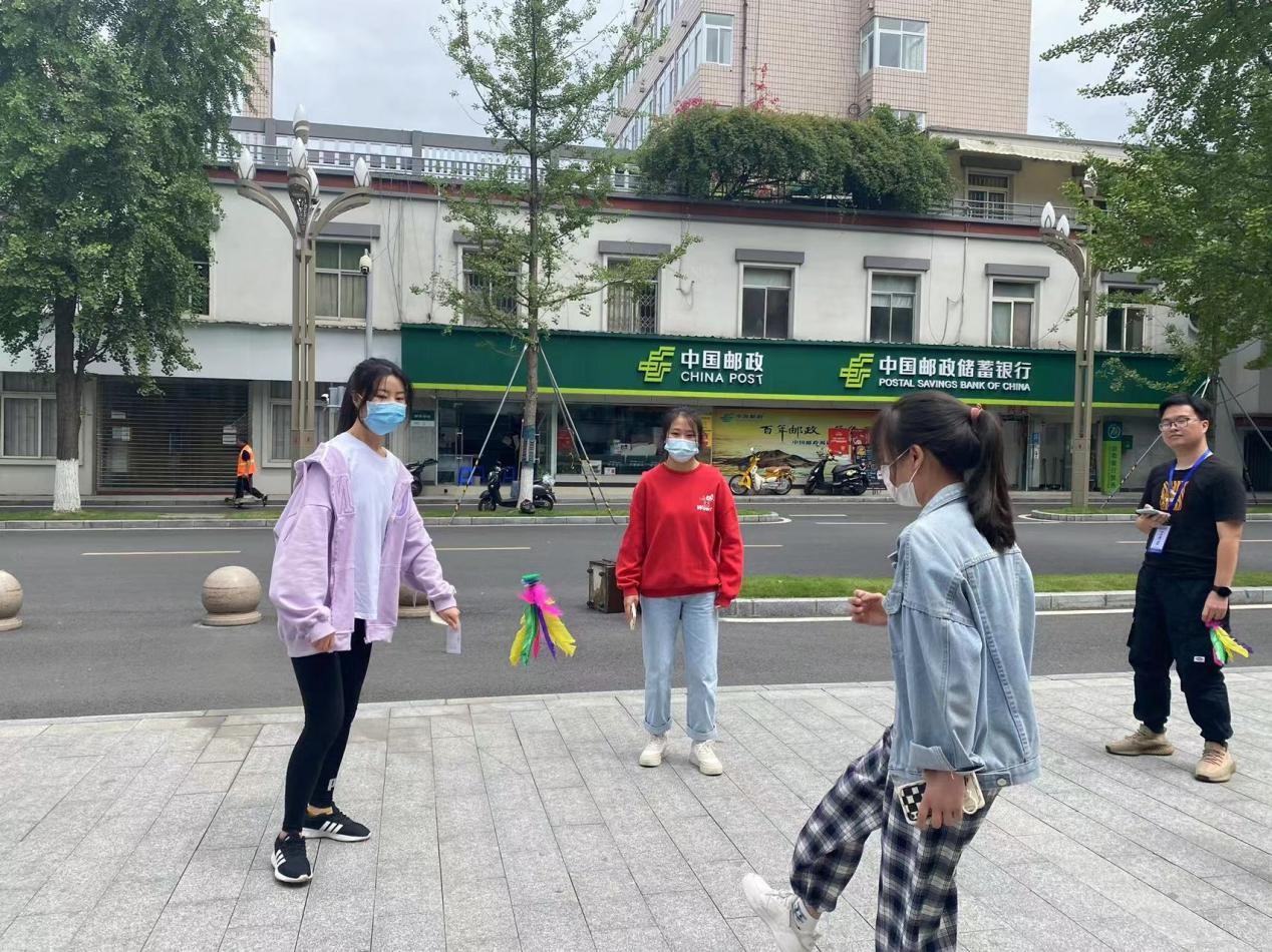 门前空地集合,待工作人员宣布活动要求、分发打卡记录表后,各组同学马上积极投入定向活动中。活动共设置了组合踢毽子、羽毛球对决、画笔传情、运动知识问答和齐心协力五个主题任务,分别散落于学校的各个角落。