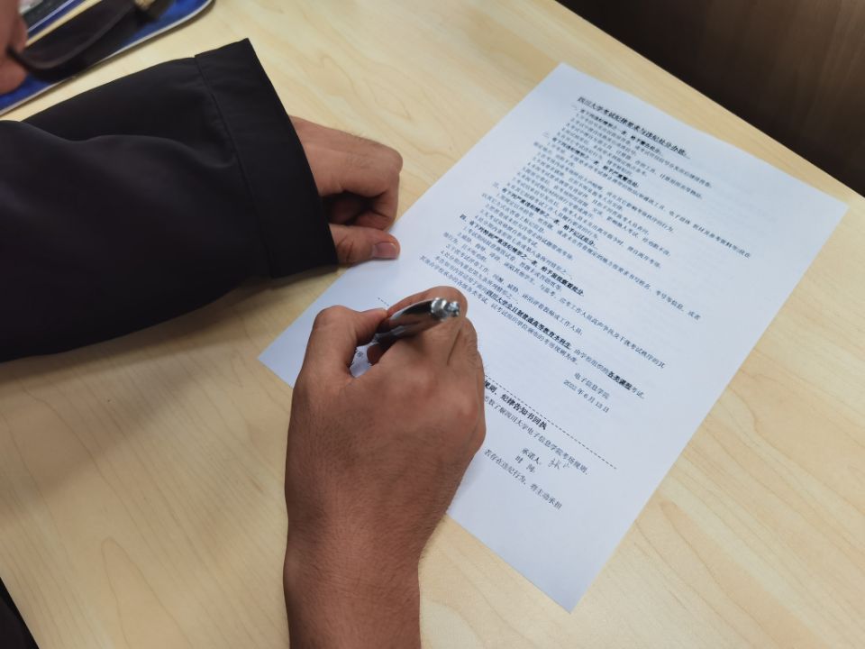 高度重视同学们的考试诚信问题,并结合往年考试时学生违纪舞弊被严肃处理的事例,提醒同学们要以诚实守信为荣,以考试违纪为耻。她还提醒同学们注意考场的相关规定细则,切记不要因为大意疏忽而违反了考场纪律。随后为同学们分发了考试纪律承诺表。同学们详细阅读了考试相关纪律,并郑重承诺遵守纪律,签完名后纷纷上交。