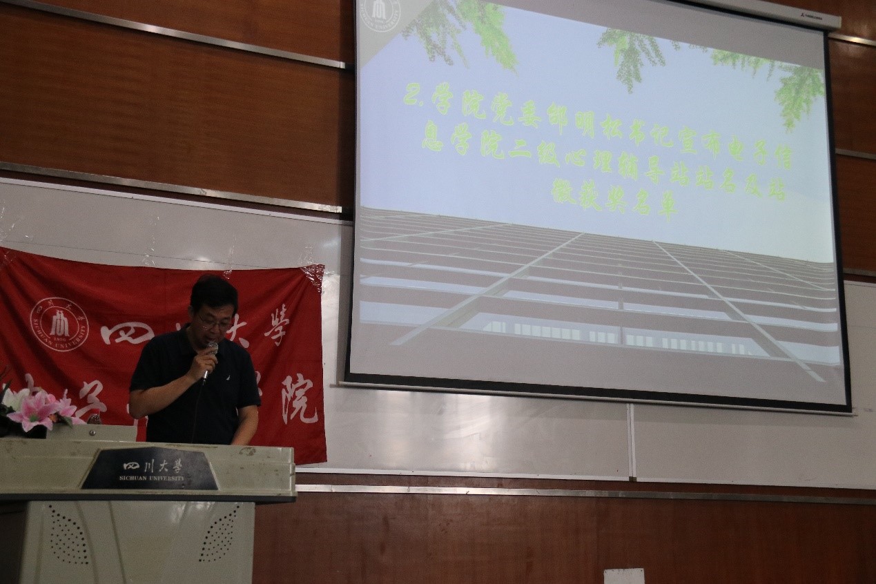 颁奖仪式结束后,二级心理辅导站站长廖勇明副书记向出席活动的全体老师、同学介绍辅导站的站点情况以及工作思路。