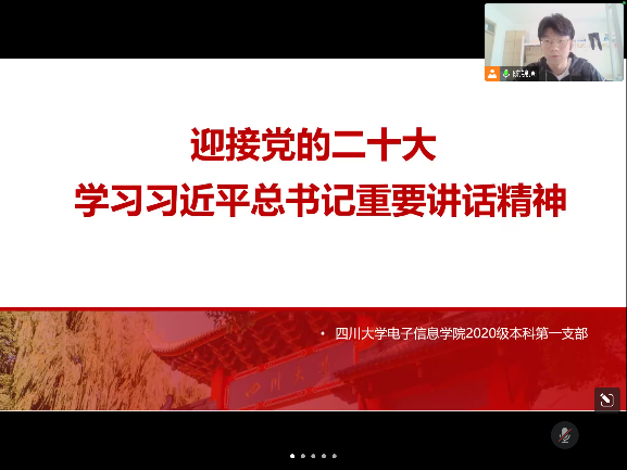 2020级本科第一党支部举行了主题为“青春献礼二十大,强国有我新征程”的线上学习活动,主要目的是“学习习近平总书记重要讲话精神,迎接党的二十大”,本次活动由陈锦周同志主持。