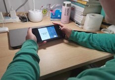 同学们认真观看会议