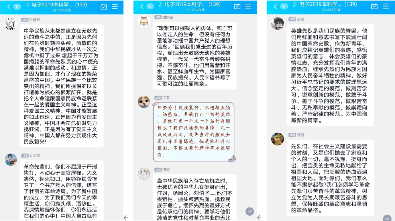 各位党员与预备党员积极参与活动,学习英烈事迹,讲述身边的党史故事,表达对革命先辈的哀思与缅怀,并积极在线上发表学习感悟。刘忠诚同志感悟道江姐在平凡而伟大的一生中能够坚守住内心的信念,是有着中国共产党人特有的精神食粮,它淬炼于我们党艰苦创业的奋斗历程之中,书写着一代代共产党人努力拼搏、砥砺奋进的壮志豪情,是我们党宝贵的精神财富;张靖同志感悟道是党的信仰、心中的责任、人民的幸福生活支撑着民族英雄杨靖宇将军在如此恶劣的情况下依旧浴血奋战;张凯同志感悟道,恽代英作为革命先烈,他的精神特别值得我们传承与发扬,一方面,应当学习他对理想信念的坚定不渝,树立远大理想,并为之不懈奋斗,另一方面,也要学习恽代英刻苦学习、博览群书、勤于思考的精神,不断加强自身修养、奉献社会;兰洲同志感悟道自己闭上眼睛,心潮澎湃,久久不能平静,黄继光的光辉形象怎样也挥散不去,思绪仿佛回到了半个世纪前那个战火纷飞的岁月,耳边又回响起嘹亮、威武、雄壮的红色摇滚--中国人民志愿军战歌,为了保卫祖国,为了保卫家乡,英勇战斗是民族的脊梁,鸭绿江水在静静地流淌,嘹亮的军歌在耳边回荡。此外,还有许多同志发表了慷慨激昂的感悟。