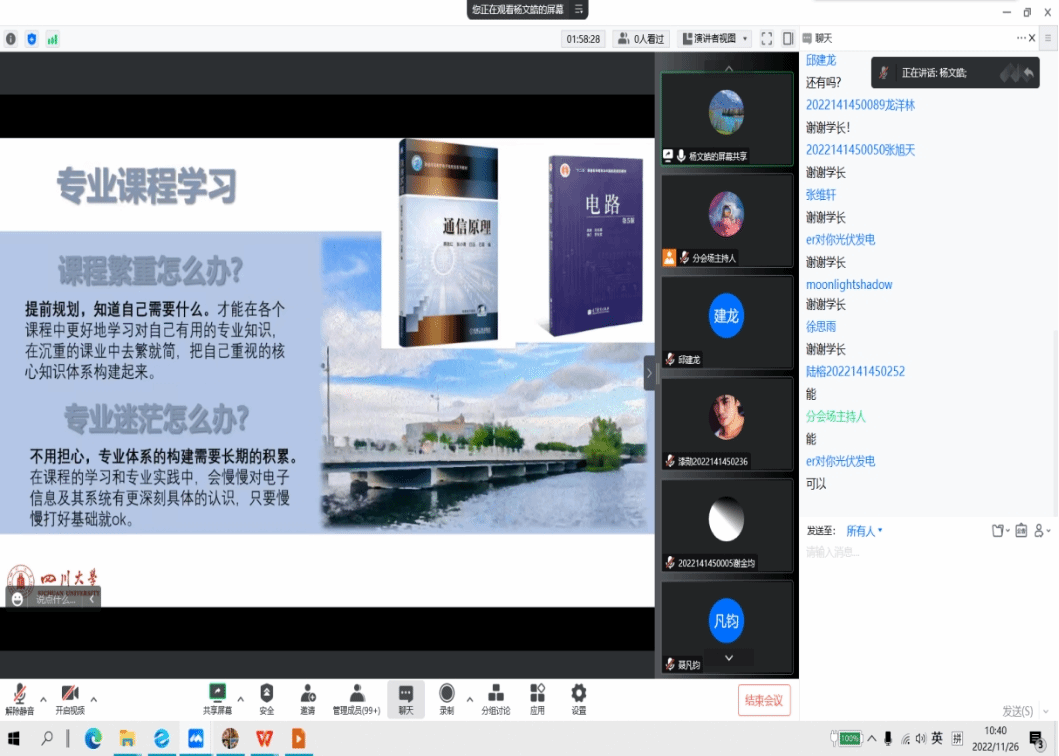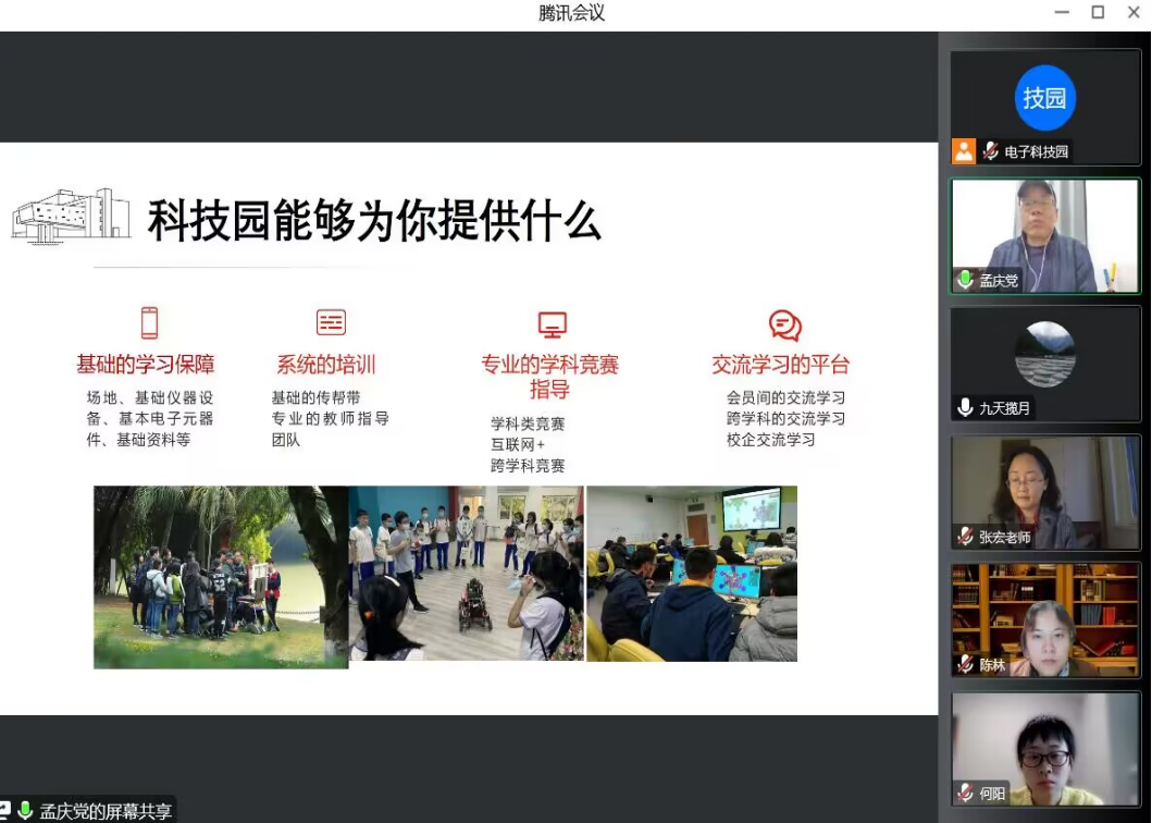 首先,会议开始前领导老师入座,主持人刘庆梅、杨修宣布会场纪律和注意事项。上午9点整,议程正式拉开帷幕,主持人介绍到会领导及老师,并请廖勇明副书记做了议程致辞。接下来,各位老师以自己的经验做了相关分享。孟庆党老师亲切地说明了科技园与同学的密切关系,表达了对科技研究的真诚;李小舜老师用幽默生趣的话语分享了科技园给同学的收获以及同学、科技、世界的相辅相成。随着老师分享的结束和领导老师的离场,两个分会场扬起了学姐学长分享经验的声音。分别在分会场一的廖佳佳学姐、吴宇峰学长和在分会场二的邱建龙学长、杨文皓学长分享了学习方法和简单的科研技巧。分享结束后,同学们积极向学长学姐们提问并得到了回答和指导。至此,电子科技园2022会员大会暨学术交流会议程圆满结束。