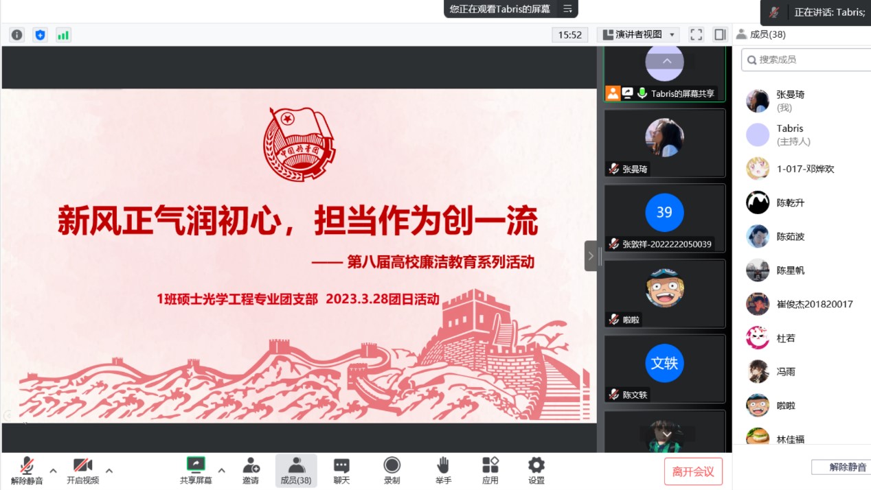 加强党风廉政建设、营造风清气正氛围是广大人民群众的心愿。同学们纷纷表示,通过此次廉洁教育的学习,更加坚定了自己不忘初心使命、严守纪律的信念和决心。学生干部及党员同志们表示,在今后的日常生活和学习工作中,将更加端正廉洁态度,谦虚谨慎、戒骄戒躁、艰苦奋斗、敢于斗争,永葆廉洁本色,不断增强“四个意识”,坚定“四个自信”,做到“两个维护”,以朝气蓬勃、一往无前的精神状态,在全面建设社会主义现代化国家的火热实践中,让青春绽放绚丽之花!