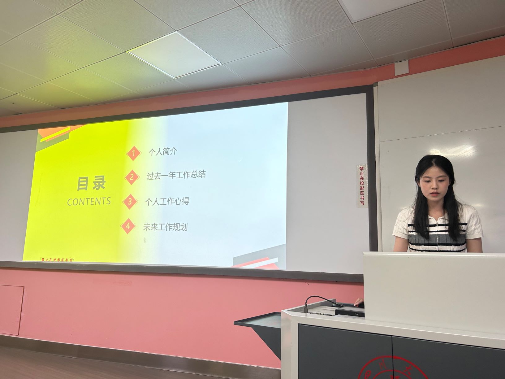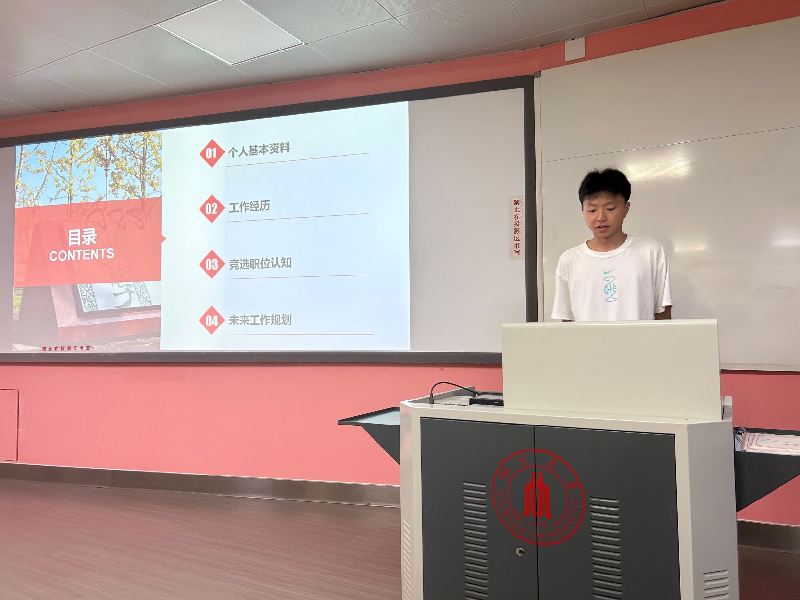 本次干部竞选大会由现任宣传媒体中心部长蔡睿同学主持,大会首先进行的是2022-2023学年工作总结。现任主席郭俊峰同学汇报了研分会过去一年的工作内容,并总结了不足之处,同时也表达了对研分会成员工作的认可,对8bo即时比分