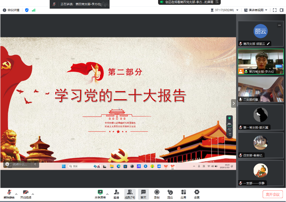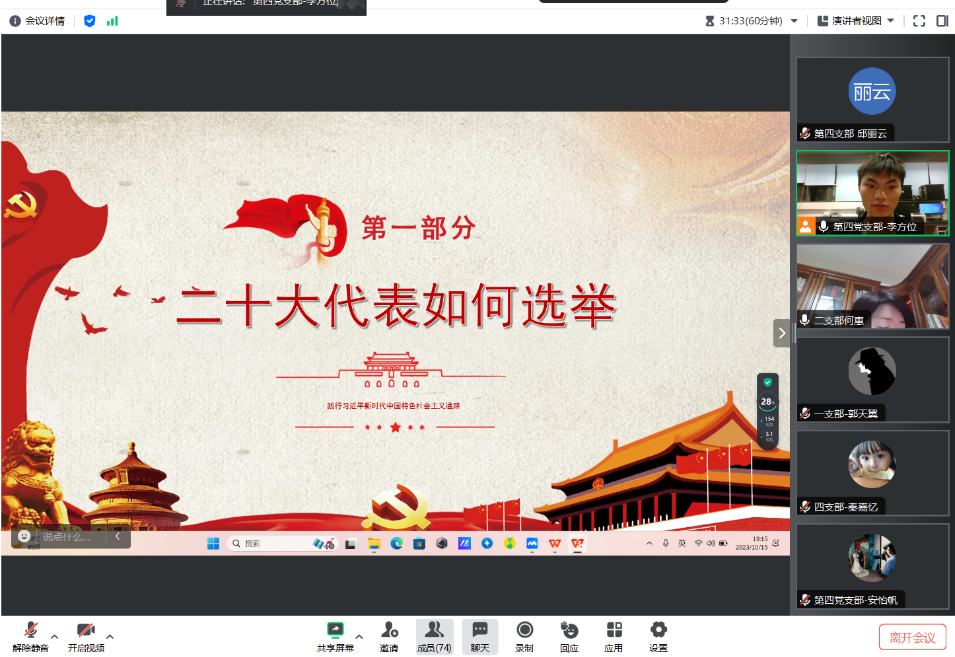 2023级研究生各党支部联合开展主题为“学习二十大,永远跟党走”的党支部学习大会。会议主要围绕“二十大代表如何选举”和“学习党的二十大报告”两个主题展开。本次会议以线上的方式举行,第二党支部书记兼2023级研究生辅导员何惠老师以及2023级研究生全体党员参加会议。