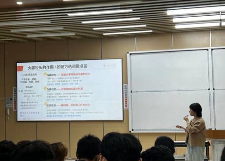 杨姿学姐以《关于紧缺选调生的认识与规划》为题,从紧缺选调生的介绍,公务员的工作模式介绍,大学经历于考公的作用这三个方面向大家展开具体分享。同时结合自身大学经历,向同学们提出了许多实用的具体建议,为想要考公的同学们点明了方向。