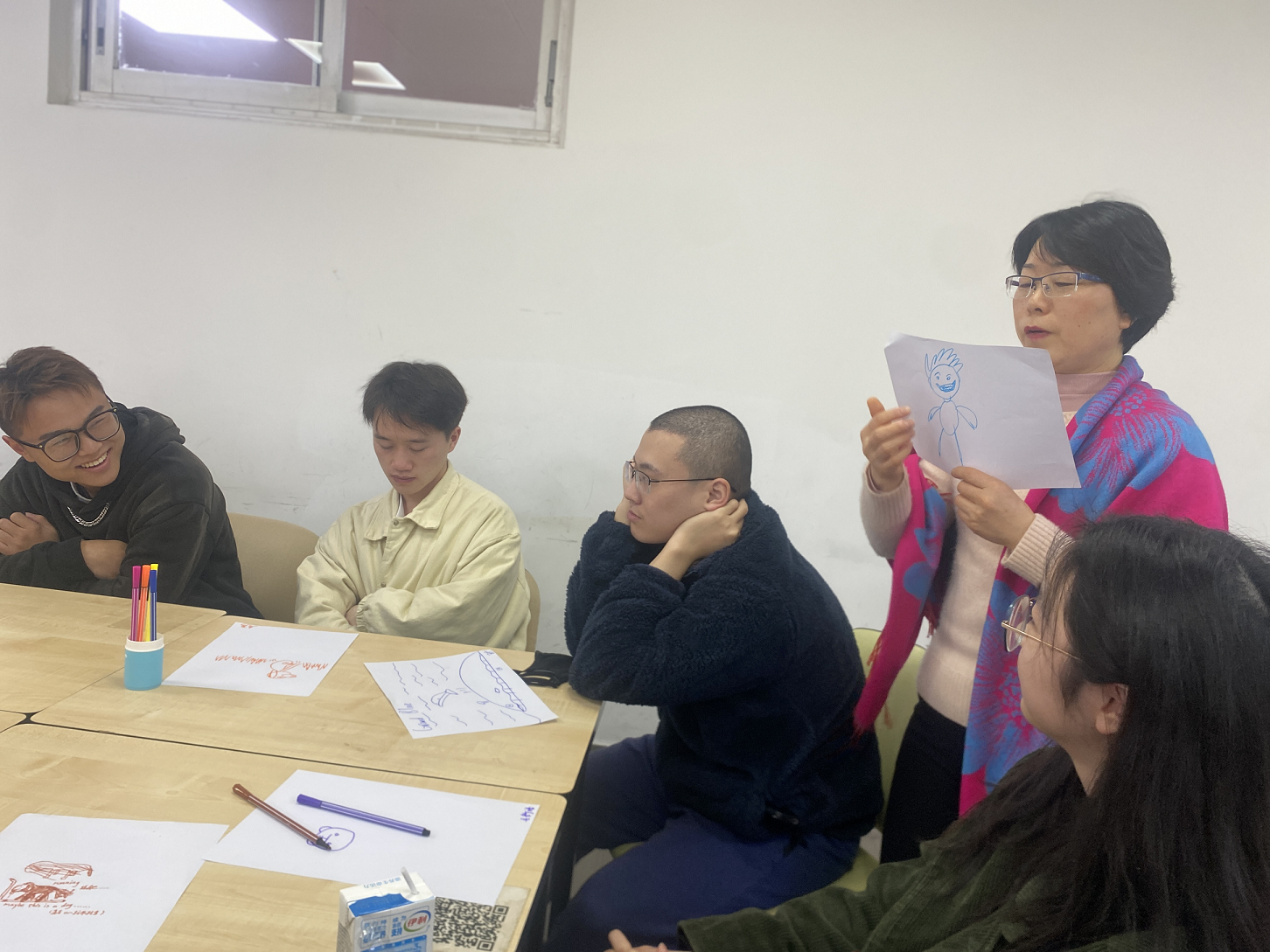 完成“在当下”活动之后,何惠老师引导同学们在纸上画下自己心里的动物。这个活动旨在让同学们通过绘画表达自己的情感和内心需求,同时也是一种放松和愉悦的方式。同学们积极参与,纷纷画下了自己喜欢的动物,有的同学画了一只在跑步机上运动的小狗,有的同学画了一只自由的鸟,还有的同学画了一只无拘无束的龙。通过简单的绘画,何老师能够从心理学的角度对同学们的内心情感和想法进行精准的解读,帮助同学们进一步认识自己的情绪和压力,剖析自己。