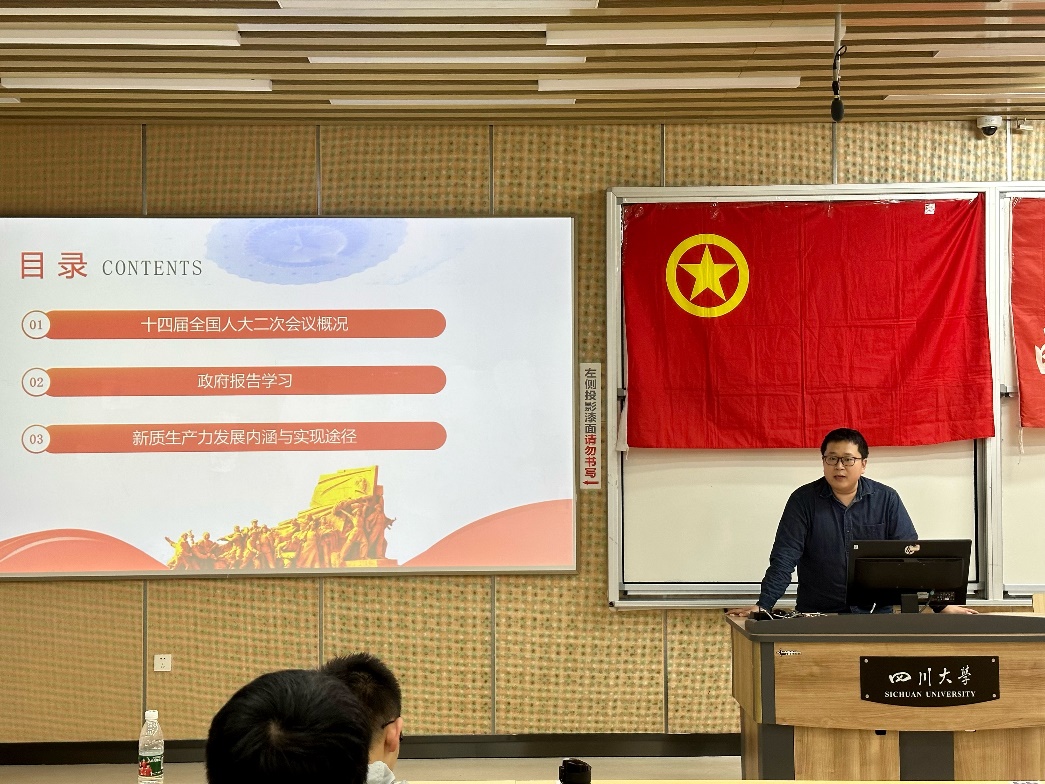 为深入学习贯彻全国两会精神,提升同学们对于时代发展动向的把握,培养创新思维和创新能力,3月29日晚上,由院团委主办的“以新促质,创新质效——从两会谈新质生产力发展”主题团课于四川大学江安校区综合楼C203顺利举行。本次主题团课由四川大学青年讲师团成员、院团委副书记申鑫老师主讲,部分团学干部、学生代表参加。