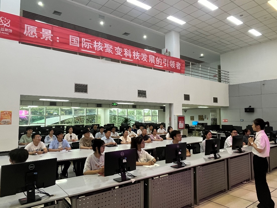 在团十九大代表、聚变科学所团委书记郑雪博士的带领下,电子师生走入中国环流指挥控制中心,西物院党委组织部部长、团委书记黄蓉陪同。郑雪首先介绍了“人造太阳”即可控核聚变研究装置的工作原理、技术优势以及未来发展及应用前景,激发了在场同学对核聚变技术的兴趣并简要讲解了如“人造太阳防火墙”、超强电磁场约束以及基于中子束的等离子体加热等先进技术手段,让同学们对核聚变技术有了更深的认识。随后,进入装置主机大厅,共同参观了中国环流二号与中国环流三号,并对“人造太阳”的结构进行进一步讲解,在场的青年学生受益匪浅。
