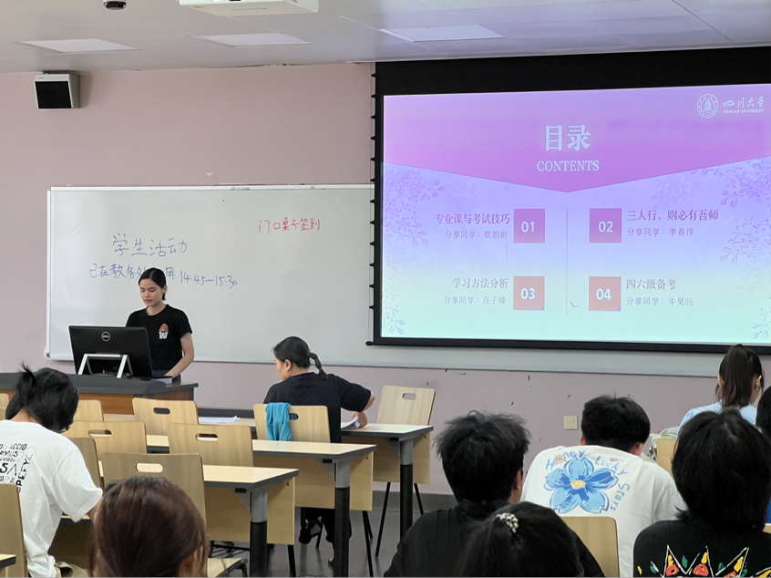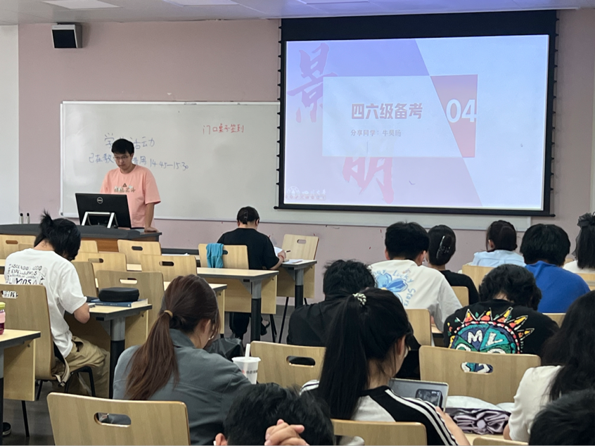 最后,由牛昊旸同学进行四六级备考的经验分享,他首先向大家讲述了四六级试卷的分数构成,并且分析每道题目应该安排的时间是多少,让同学们有一个全局的框架,其次,他着重从几个重点题型向大家分享了解题之道,同学们纷纷表示收获很多。