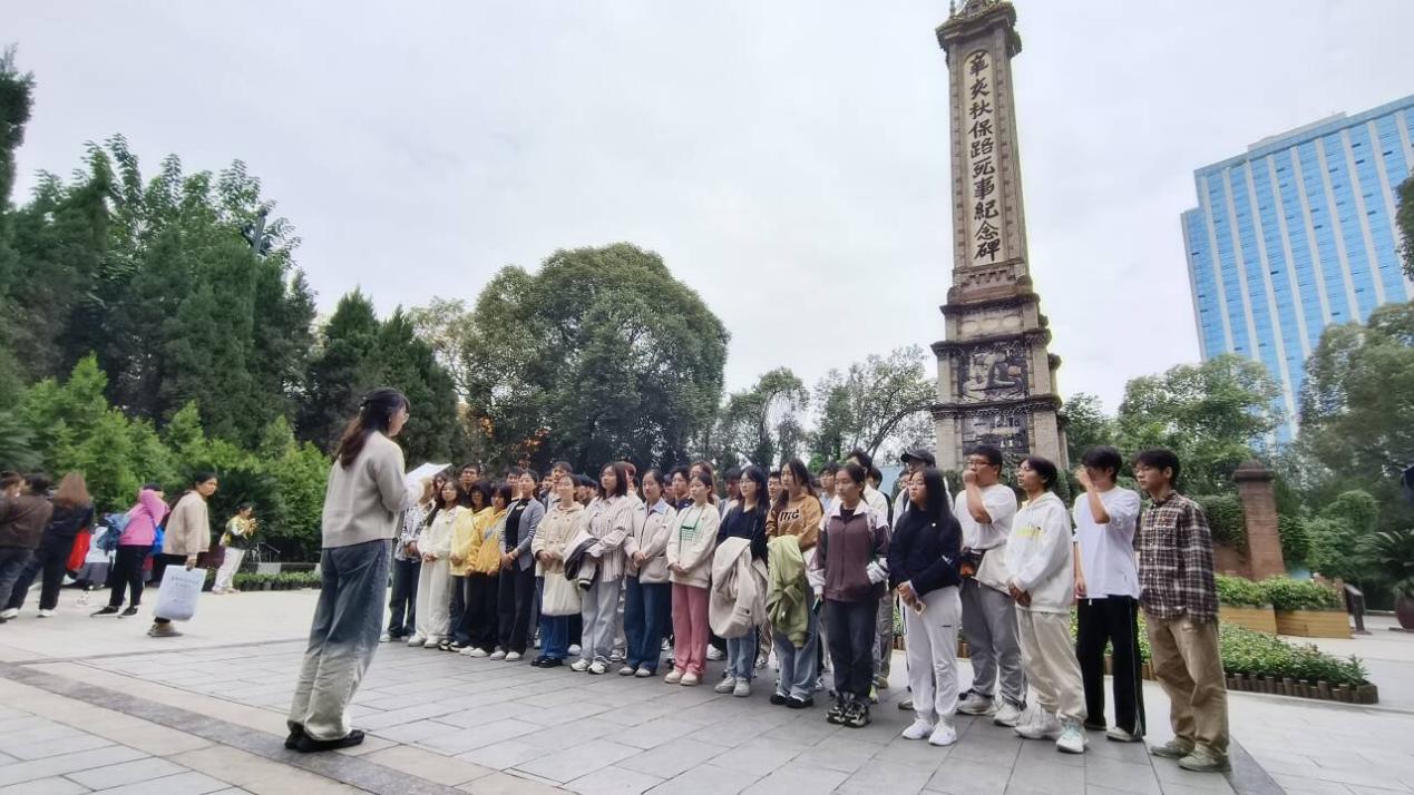 在参观尾声之际,讲解员带领大家来到了辛亥秋保路死事纪念碑。她提及,孙中山先生曾对四川保路运动的重要性给予高度评价——“若没有四川保路同志会的起义,武昌革命或者要推迟一年半载”。原来历史书上的一笔带过,竟是如此撼人心扉。随着对这段历史不断深入地学习、思考,碑下的同学们的心绪久久不能平复。