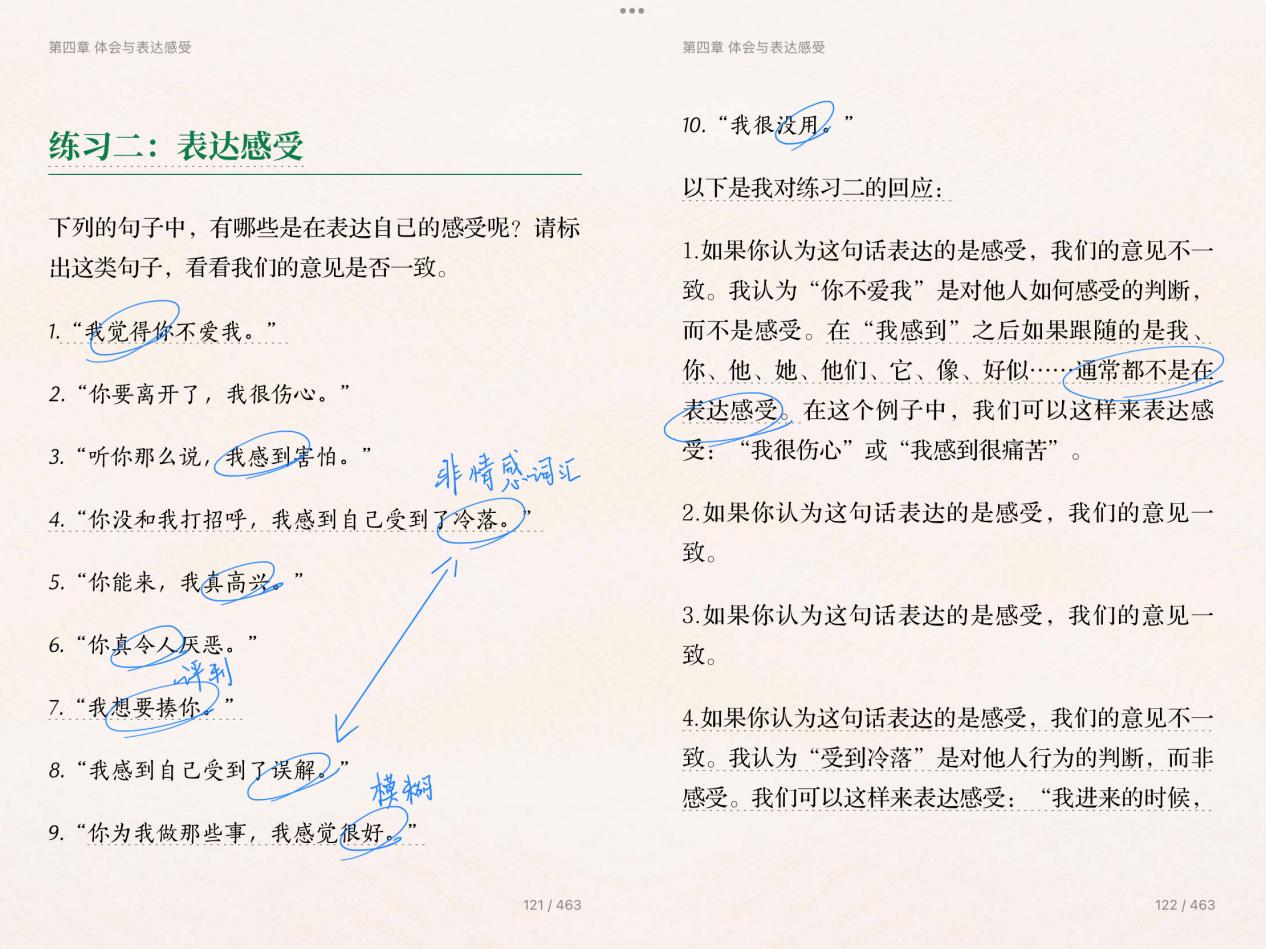 活动伊始,两位领读人与同学们一起阅读了《非暴力沟通》这本书的第三章与第四章;领读人每带领完成一个段落后,邀请线上线下同学对书里的内容进行分析和解读。