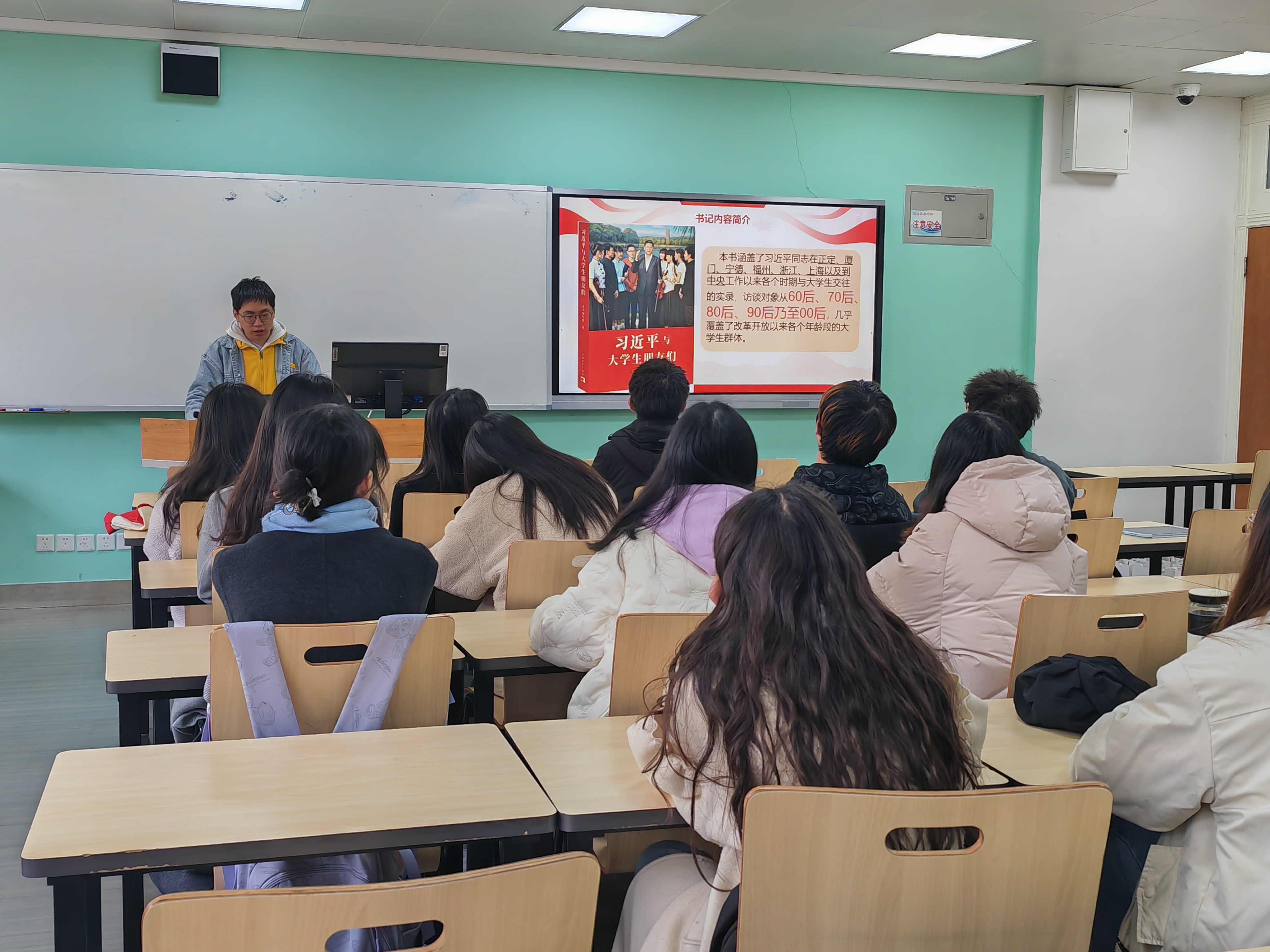 随后,廖浩然同学代表小组向同学们分享了《习近平与大学生朋友们》这本书的精彩内容。他通过生动形象的故事讲述,将习近平总书记的平易近人与对大学生的关心展现得淋漓尽致。其中,“志存高远,行循自然”这句嘱托,不仅是对张宏樑的深情寄语,更是对全体当代大学生的殷切期盼。大家沉浸在故事中,仿佛与习近平总书记和书中的大学生们共同经历了那段难忘的岁月。参与学习的同学纷纷表示,会牢记习总书记的嘱托,树立远大理想,争做时代弄潮儿。
