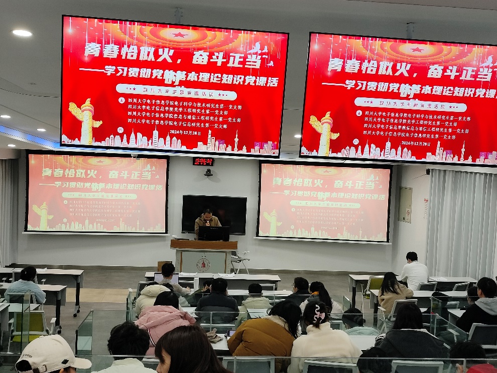 电子科学与技术研究生第一党支部、光学工程研究生第一党支部、信息与通信工程研究生第一党支部和电子信息研究生第一党支部在望江校区基础教学楼C座103联合举办了一场主题为“青春恰似火,奋斗正当时”——学习贯彻党的基本理论知识党课活动。本次党支部学习大会由于鲲鹏同志主持,各支部全体党员和积极分子参会。