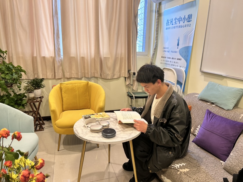 二级心理辅导站和四川大学“e心致学”辅导员工作室联合承办的“在凡尘中小憩”沁心读书会第七次活动在四川大学望江校区东三教学楼525室顺利举办。本次活动由何惠老师线上参与并指导,辅导站学生站长李岩峰领读,线上线下同时开展。