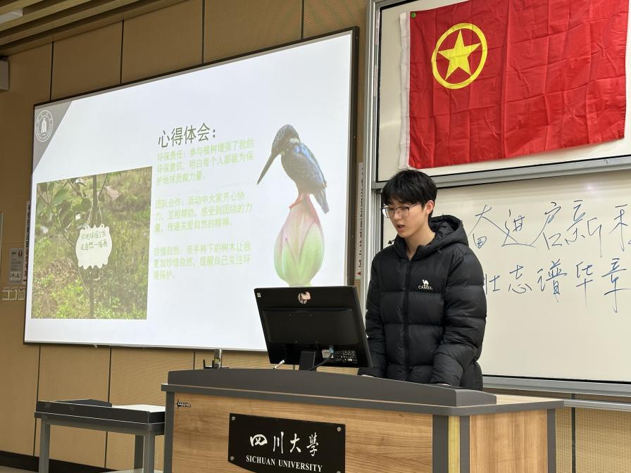 接着,进行了志愿服务分享。3月8日,三个团支部集结18名团员前往成都市九隆成生态园进行植树志愿服务活动,响应三月雷锋月与植树节的号召。于是,在团日活动中,三名志愿者代表分享了自己在植树活动中的感悟。其他同学也纷纷表示,今后将继续参与各类志愿活动,用实际行动践行雷锋精神。