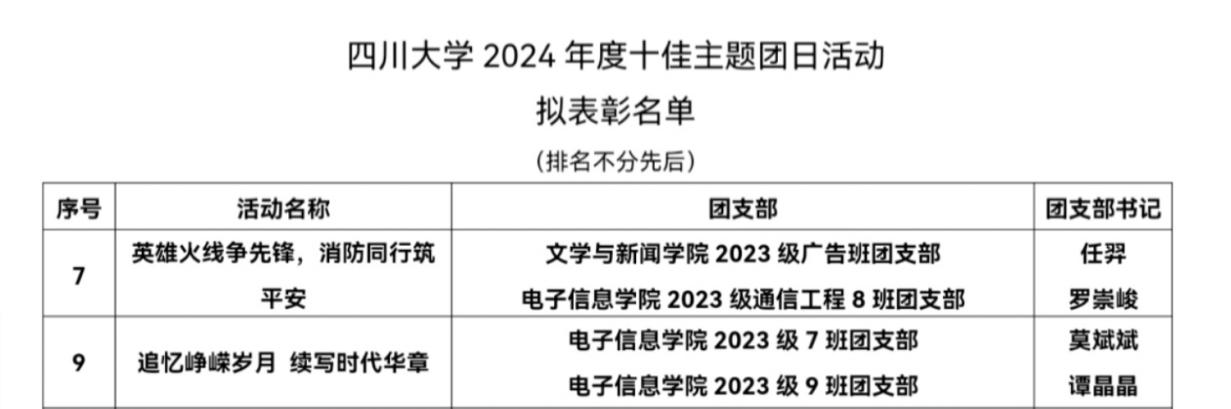 团支部举办的“英雄火线争先锋,消防同行筑平安”主题团日活动脱颖而出,成功入选四川大学2024年度十佳主题团日活动。